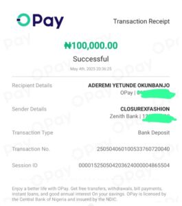 - Bank Statement: Showing a ₦100,000 credit on 4 May 2024 from Closurex Fashion, corresponding to the partial first payment.