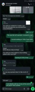 Aderemi also shared a 2024 chat with ArtisanOga in which she sought help after her salary was withheld—an attempt that, she says, did not lead to resolution.